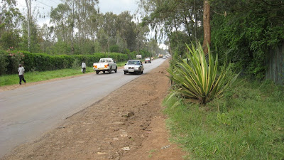 So I did what I said I was going to do to relieve my boredom. I walked down our road – took pics. Then I got a mat but there I was not brave enough to take pictures, I don't enjoy being stared at or asked for money. But I'm going to do it one of these days before I leave for America, even if it means telling people I'm writing a article about public transport (and no that's not a lie cause I'm writing one for an assignment for my correspondence course). Then I hung out at Nakumatt Karen (Nakumatt is like Walmart but more expensive and less extensive). I bought a newspaper and a coffee at a little coffee shop (David it was the closest to one of your mochas I've had in Kenya but still not so good). Then to my horror it started to rain. Sadly in my pictures you can't see what I'm wear but I was wear a sundress (as in spaghetti straps) with a tank top underneath and jean capris with Teva sandals. In Kenya when it rains its not like in America. In America if its warm out and it rains its still warm out, in Kenya if it rains, it doesn't matter what the weather was like 1 minute before the rain starts, when it rains it always gets cold. I was freezing, sitting outside at a table (with one of those little umbrella things over it) and the rain was blowing on me. My mocha helped a little bit but not much. Then my dad came but so did one of my friends – Viyerrah (the only pictures I have of him are from Msafara, I'll take some next time we hang out and post them). He's an intern at my church but is on loan to a sister church. He lives about 10 minutes from my house and we have been hanging out a couple of times a week. So after paying Dad 50 shilllings (75 cents) I convinced him to pick me up at the end of our road in about an hour. Viyerrah and I wandered around Nakumatt and talked before I got a Mat back home. Oh and Viyerrah loaned me his sweater so I was no longer freezing! It was a fun evening. Here are some pictures: